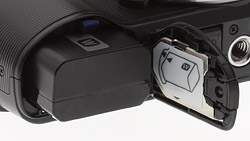 The top deck is similar to the NEX-3, simplified with the removal of the left and right microphones, while the shutter button has moved back and the power switch surrounding it is now actuated from the side rather than the rear. Playback and Record buttons are in roughly the same locations. A large plastic, rubber-tethered port door just right of the shiny HD logo opens to reveal the Smart Accessory Terminal, meant to attach flashes, optional microphones, and viewfinders. An included flash mounts here with a thumbscrew, integrating well into the design.
