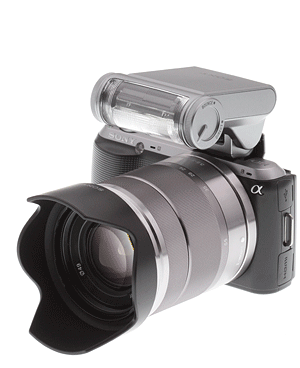 Flash. While the NEX-C3 ships with a small screw-mounted flash that flips up on demand, Sony's created a new mid-size flash called the HVL-F20S, which also attaches via the Smart Accessory Terminal. The new unit requires no batteries, instead taking power directly from the camera's battery. As seen in the animation at right, the HVL-F20S flips up to power on, down to power off. Two internal mechanisms allow you to point the flash element forward or upward to bounce light off the ceiling or walls. A flash diffuser can also swivel into place to cover a wider area in either mode.