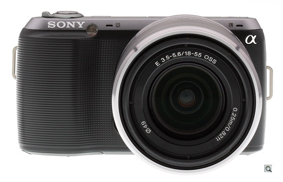 Moving the shutter button back off the grip bulge allowed room for the Sony logo to appear in a more prominent position on the front, above the grip, upper left of the AF-assist/Self-timer lamp. The right and left microphones face forward (rather than upward as on the NEX-3) positioned on opposite sides of the lens mount, and the lens release button is in the same position as its predecessors. Note the silver Alpha logo in the upper right corner, while the A-mount cameras have the cinnabar (orange) logo.