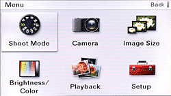 Because there is no physical mode dial, changing modes is a slightly longer process, requiring the user to press the Menu button, then navigate to the Mode dial graphic in the six-icon menu, and then press the navigation disk's center button. Then a large mode dial appears on the right of the screen and turning the navigation disk turns the virtual dial to the desired mode. From there you press the center button again, and the camera returns to Record mode with the new mode selected.