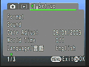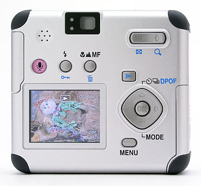 The Optio 33WR has a 2.8x, 5.7-16mm lens, equivalent to a 37-104mm lens on a 35mm camera. A clear, plastic shield protects the lens at all times, so you don't have to worry about losing the lens cap. Unlike most digicams with optical zoom lenses, the 33WR's lens does not telescope out from the main body when the camera is powered on. Thus, the camera's front remains flat at all times. Maximum aperture ranges from f/2.8 to f/3.9, depending on the zoom position. The lens focuses over a range of 0.98 feet (30 centimeters) to infinity in normal shooting mode, with a Macro option covering from 0.4 inches to 1.6 feet (1 to 50 centimeters). The Optio 33WR offers both manual and automatic focus (AF) control, with Spot and Multiple AF modes. Spot AF mode bases focus on the very center of the frame, while Multiple AF mode judges focus based on a larger area around the center of the frame. There's also an Infinity / Landscape fixed focus setting that locks focus at infinity for taking photographs of distant objects. In addition to the optical zoom, the Optio 33WR offers a maximum of 4x digital zoom, (although I always remind readers that using digital zoom decreases image quality, since it simply enlarges the center pixels of the CCD image). For composing shots, the 33WR has a real-image optical viewfinder, as well as a 1.6-inch, color TFT LCD monitor, complete with an optional histogram display in both record and playback modes.