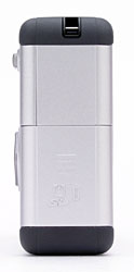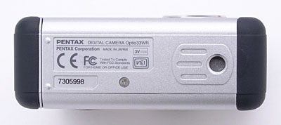 The reasonably smooth front panel of the camera features the lens, flash, optical viewfinder window, self-timer lamp, and a tiny microphone. A clear, plastic shield protects the lens at all times, so there's no lens cap to worry about losing. (However, this also means that you can easily smudge the lens front with a finger, so keep that in mind when holding the camera.) The 33WR doesn't have any type of finger grip, so be sure to keep the wrist strap securely fastened when shooting. (The rubbery corners are handy for picking the camera up, but in my view don't aren't much help in keeping it from slipping out of your hand.)