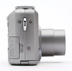 The front of the camera holds the lens, flash, optical viewfinder window, flash sensor, self-timer lamp, tiny microphone port, and the sensor window for the optional remote control. A shutter-like, retractable lens cover protects the lens whenever the camera is powered off, sliding quickly out of the way when the camera is turned on. The lens then telescopes out from the camera body about an inch. The front of the camera is flat without any ridges to provide purchase for your fingers, making the grip a little more tenuous than I'd like. As a result, I'd recommend keeping the wrist strap securely around your wrist when holding the camera.
