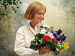Good color with the Incandescent white balance, good exposure as well. This shot is always a very tough test of a camera's white balance capability, given the strong, yellowish color cast of the household incandescent bulbs used for the lighting, but the Verve handled it better than most. The Verve's Incandescent white balance setting did the best job here, as the Auto setting resulted in a stronger yellow cast. (Although I should note that many people prefer a pronounced warm cast like this for shots taken under incandescent lighting.) Marti's skin tones are a little pink, however, and the blue flowers are dark and purplish (almost to be expected with this shot). Image noise is a little high here at ISO 100, but detail is strong. (Marti's features are soft though, because the camera focused on the bouquet, rather than her face.) The main exposure was taken with a +0.7 EV exposure compensation adjustment, slightly less than the average required here. A very good job with a tough light source. To view the entire exposure series from zero to +1.3 EV, see files VRVINTP0.HTM