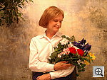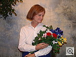 noise is high in the shadows. The extreme tonal range of this image makes it a tough shot for many digicams, which is precisely why I set it up this way, and why I shoot it with no fill flash or reflector to open the shadows. The object is to hold both highlight and shadow detail without producing a "flat" picture with muddy colors, and the Optio MX had a hard time with the harsh lighting, despite my use of its low contrast setting. The shot at right was taken with a +1.0 EV exposure compensation adjustment, and the camera's contrast setting adjusted to its "low" value. Despite the use of the low contrast setting, the Optio MX had a hard time with the harsh lighting, losing essentially all the highlight detail on this (admittedly very tough) test. The Auto white balance setting produced the most accurate overall color, as the Daylight setting was reddish, and the Manual setting quite warm and yellow. Marti's skin tones are a little flat-looking here, with a bit of a brownish-orange look to them, and the blue flowers in the bouquet are rather dark, albeit quite hue-accurate. (Many digicams have trouble with this blue, which is in reality a light navy blue with just hints of purple in it.) Although the colors are a little dark throughout the frame, the hues are actually very accurate. Resolution is moderately high, and details are fairly strong in the flower bouquet and on Marti's hands. Detail is surprisingly good in the deep shadows, but the noise is there is fairly high. To view the entire exposure series from zero to +1.75 EV, see files OMXOUTAP0.HTM