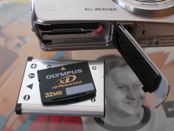 Card and Battery. The xD-Picture card is really very small, maybe too small. The battery, which takes five hours to charge, is small, too. Note the black weather seal on the compartment door.