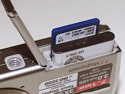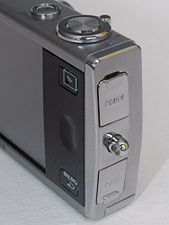 The eyelet for the wrist strap is chrome, too, and easy to thread, which isn't always the case. Above the eyelet, a chrome flap reveals the USB port. Below it, a matching chrome flap protects the DC-In port. The speaker and a plastic tripod socket join the battery/memory card compartment on the bottom. The cover for that compartment can be tricky to open. Sometimes, I didn't slide it far enough out and it didn't completely open. Give it a good push.