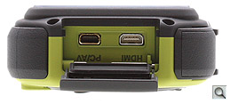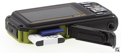 As you'd expect, the Pentax W90's battery and output compartments are sealed against the elements, so you'll have to unlock them to gain access. The lock mechanism is a bit on the small side so you'll have to wedge a fingernail into the locking mechanism to spring and slide the hatch. A few times I found myself taking a few passes at opening the memory card bay before it sprung open.