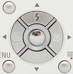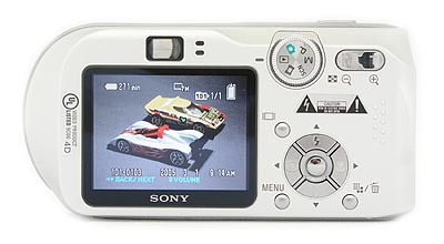The camera's rear panel holds the remaining camera controls and function buttons, along with a 2.0-inch color LCD monitor for previewing and playing back images, and the optical viewfinder window. The LCD display reports a variety of camera and exposure settings, including the aperture and shutter speed settings (a nice bonus for those interested in how the camera will expose the image, even when it's working in Program mode) and time remaining on the InfoLITHIUM battery. The optical viewfinder is located directly above and centered on the LCD monitor, and has two LED lamps along the right edge of the window, each of which reports the current status of various camera functions. The camera's Zoom control is in the upper right corner, conveniently located right above a small ridge for better thumb traction when holding the camera. In the center of the back panel is a Five-way Arrow pad, with small arrows pointing in four directions (Up, Down, Left, and Right) and a set button in the middle. Each serves multiple functions, navigating onscreen menus scrolling between captured images in playback mode, or activating different camera functions (Flash, Self-Timer, Quick Review, and Macro).