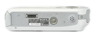 The right side of the camera (as viewed from the rear) houses the battery and Memory Stick compartment, protected by an easy to open, hinged plastic door. A small plastic door-within-a-door pops open to allow easy connection of the charger cable, since the camera comes with no external battery charger. Oddly, under the main door, right next to the Memory Stick slot, is a card access light where the owner is unlikely to see it; there is no other external card access light. (I guess it's still useful though, as you'd have to open the door to remove the memory card, and the access light would then warn you to wait before removing it.) Above the door is a small eyelet for attaching the wrist strap.