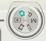 The camera's top panel includes only the Shutter button and a small Power button, which is encircled by a green power LED. To the left of the Power button is the camera's tiny microphone. Also from the top view, you can see the ridged Mode dial.