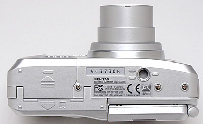 The Optio 230's bottom panel is reasonably flat, though the area directly beneath the LCD monitor is indented somewhat. The battery compartment and CompactFlash slot both open from the bottom, a setup I'm not too fond of for studio shooting. (This means you have to dismount the camera from the tripod whenever you want to change memory cards or batteries.) Given the Optio 230's point-and-shoot design and compact size though, I doubt this will be an issue for many users. A plastic threaded tripod mount is slightly off-center from the lens, but provides a fairly stable tripod connection.