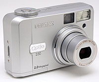 Pentax is a camera maker with a long tradition in the film-based world, but a relative newcomer to the digital arena. They co-developed several cameras with Hewlett Packard, but have now stepped out on their own, with digicams entirely of their own design. Last year, they came out with the Optio 330 and 430, three and four-megapixel models respectively. Now, they've developed the Optio 230, a two megapixel model clearly aimed at a more entry-level price point. - The 230's features and operating scheme are very similar to the two earlier models, but cost saving methods are apparent in its all-plastic case design, rather than the exceptional metal cases of its predecessors. Despite the obvious cost paring, the 230 is a very worthy little camera, a nice, compact choice for users interested in the two megapixel category.
