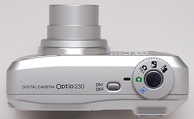 Apart from the lens barrel, the Optio 230 has a smooth front panel. With the lens stowed, the lens barrel only protrudes a quarter-inch or so. Once extended, the telescoping lens protrudes an additional 3/4 of an inch from the camera body. A protective shutter protects the lens when not in use, automatically opening whenever the camera is powered on with the Mode dial is set to a capture position. Also on the front panel are the flash, optical viewfinder window, and self-timer lamp. A very slight lip serves as a small finger grip down the right side (as viewed from the back).