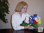 Tough Shot, Auto white balance did the best, but still left more color cast than we like. Needs a lot of exposure compensation adjustment though... This shot is always a very tough test of a camera's white balance capability, given the strong, yellowish color cast of the household incandescent bulbs used for the lighting, and the P5's white balance system has some difficulty here. The Incandescent (1206 k) white balance setting produced a very warm cast, with a yellowish tint, while the Auto (1199 k) setting left a somewhat magenta tint in the image. In the end, we chose the Auto setting for our main series, and an exposure compensation adjustment of +2.0 EV (!) for our main shot. The overall shot isn't too bad, but the magenta cast left the blue flowers rather purple. Below is our standard exposure series, from zero to +2.0 EV. Readers interested in seeing the results of a range of exposures are directed to the Thumber Page, files P5INP0-6. (Adjustments range from 0 to +2.0EV, in steps of 0.3 EV) |