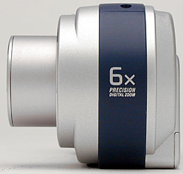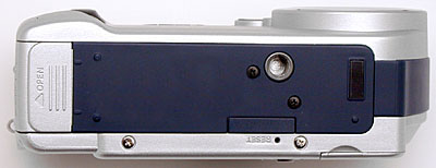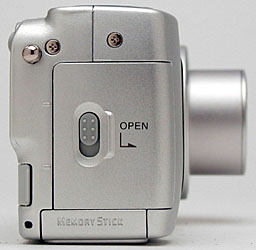 The DSC-P71 has a flat bottom panel, which holds the metal tripod socket and Memory Stick slot. (Kudos for the rugged metal tripod socket, many cameras use plastic here.) The Memory Stick compartment door slides open to reveal the card, which pops outward when pushed slightly. I was glad to see enough space between the tripod mount and Memory Stick slot to let you change the card even when mounted to a tripod. (The side-access battery compartment is a plus as well). That said, I did notice that the off-center tripod mount left the camera slightly tilted on my tripod head, making more difficult to level the camera body exactly. Given the very portable nature of the DSC-P71, I don't think this will be much of an issue for most of its users though.