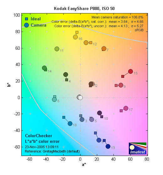 These images show the color behavior of the P880 directly. In each color swatch, the outer perimeter shows the color as actually captured by the camera, the inner square shows the color after correcting for the luminance of the photographed chart (as determined by a 2nd-order curve fit to the values of the gray swatches), and the small rectangle inside the inner square shows what the color should actually be, based on perfect rendering to the sRGB color space The major differences in the samples above are in luminance, it's clear that the colors themselves are highly accurate.