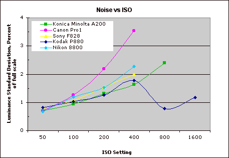 This chart compares the P880's noise performance over a range of ISOs against that of other cameras it nominally competes with. (Although it sells for less than all the cameras shown here, in some cases for much less.) As you can see, the P880's noise levels are in line with the best of its competition at ISOs from 50-400. From the chart, you'd suspect something odd was going on at ISO 800 and 1600, and it is: As mentioned before, the P880 flattens out a tremendous amount of subject detail for the sake of achieving low noise figures, producing images that are "clean," but that look like they were run through a heavy-handed median filter in Photoshop(tm). For any practical applications, forget about ISOs higher than 400 with the P880.