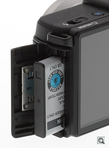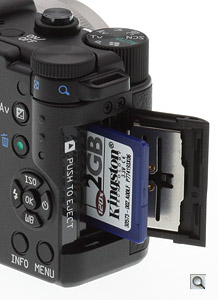 Storage. The Pentax Q accepts Secure Digital storage media, including the newer, higher capacity SDHC and SDXC types. Images are stored as 12-bit .DNG RAW files, or 8-bit JPEGs in one of three quality levels. Movies are stored as .MP4 files. The door is released with a slide to the rear, after which it swings open toward the front of the camera under spring pressure.