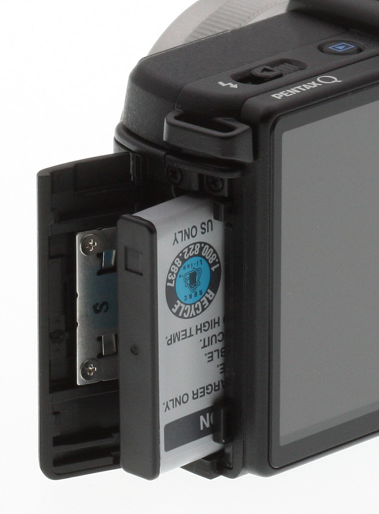Power. A proprietary D-LI68 lithium-ion rechargeable battery allows the Pentax Q to provide for 230 shots on a charge to CIPA testing standards (50% flash usage), or 160 minutes of continuous playback. This door also opens with a firm pull to the rear, followed by a springloaded swing toward the front.