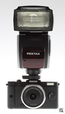 Flash. The Pentax Q includes a built-in five-mode popup flash strobe with a guide number of 7 meters / 23 feet at ISO 200. At first glance it looks to be fixed in place, and it can in fact be fired in the lowered position if desired, but it also includes an unusually tall articulation mechanism that allows coverage sufficient for a 28mm-equivalent wide angle lens. There's also a full-sized hot shoe compatible with all of Pentax's current flash strobes, although larger units--we tried the AF540FGZ, for example--prove very unwieldy, when paired with the Pentax Q's impressively compact body. The internal flash provides a red-eye reduction function, and operating modes include Auto, Auto + Redeye, On, On + Redeye, Slow Sync, Slow Sync + Redeye, Trailing Curtain Sync, and Off.