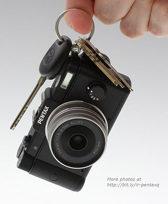 It wasn't long ago I had the pleasure of running around town with one of the largest interchangeable lens cameras on the market, the Pentax 645D. It was big, but handled well, with excellent optics and a very high-resolution sensor. Today the contrast was dramatic, carrying the very tiny Pentax Q, a small interchangeable lens camera. The experience was very different, but it was still a Pentax, a company that's pushing beyond lots of boundaries lately. The Pentax Q has smaller optics and a smaller, lower-resolution sensor. Indeed, it's so small it fits in a pocket and conceals easily in a palm--or behind an iPhone. It could even hang--as our illustration demonstrates--from a keychain, were it not worthy of better daily care than that.