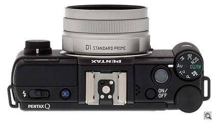 The Mode dial sits atop and dictates the shape of the small fingertip grip, just as the Rear dial describes the shape of the rear thumbgrip. Strap lugs are molded into the top plate of the Pentax Q, presumably also of magnesium alloy.