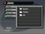 Accessed by turning the Power/Mode dial to the Play position, this mode lets you view or delete recorded images as well as set them up for printing. Pressing the Menu button in this mode pulls up the following menus: