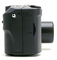 The front of the camera features the lens, built-in flash (Casio replaced the previous somewhat fragile pop-up flash that remained up whether you wanted it there or not), sensors and the front of the optical viewfinder. The protrusions on this model are very slight, with the exception of the lens which extends out beyond the camera when powered on. There is a lens cap on this model, but it can be neatly tethered to the body so you don't have to worry about losing it. One thing we noticed here is that if the lens cap is on the lens when you power up the camera, the lens extends and then retracts and the camera shuts off. We found that if you took the lens cap off before powering it up, everything worked fine. Because our evaluation model is one of the first released, we're not sure if this is a flaw with the camera or just this particular model. We are pleased to note the removal of the sliding lens cover, which was sometimes catchy in its operation and prevented removal of the CompactFlash card from its slot.