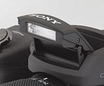 Right next to the R1's pop-up flash is Sony's now nearly ubiquitous amber AF Assist lamp. It's just as bright as the lamp on other Sony cameras; perhaps the only disappointment is that it wasn't the amazing laser AF assist found on the F828 and V3. The other big surprise is the flash mount perched right atop the R1's grip. Unusual placement, but very logical given the already significant weight out by the camera's lens. I think adding a flash would go a long way toward balancing the camera. Yep, I just tossed another manufacturer's flash on there, and the balance is far better; looks cool too. It just needs a battery grip to complete the picture, though there are no signs that there will ever be one because the battery door is not removable.