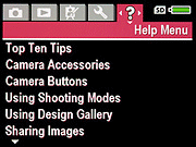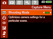 Record Mode: This mode is accessed simply by turning the camera one. In Record mode, the camera can capture still images or videos with sound, with five groups of options (Capture, Playback, Design Gallery Menu, Setup and Help) available through the Record mode settings menu. The groups are arranged with a "tabbed" layout, allowing you to access Capture Menu, Playback Menu, Design Gallery Menu, Setup Menu or Help Menu items in any camera mode by paging between tabs. Options can either be cycled through on the menu screen with the left / right arrow buttons, or the OK button can be pressed to bring up a screen describing the specific option and allowing it to be altered, and all Capture Menu options also offer a Help screen describing them in more detail: