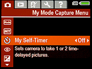 Shooting Mode: Lets you choose between 17 shooting modes: Auto, Landscape, Portrait, Theatre, Panorama (l.-r.), Panorama (r.-l.), Action, Night Portrait, Night Scenery, Beach, Snow, Sunset, Document, Aperture Priority, Shutter Priority, Manual, and My Mode. (Note: Subsequent Capture Menu screen shots were taken in My Mode. My Mode lets you save your own preferred settings for quick recall, and the R927 can be programmed to start-up in My Mode by default if so desired. All menu options are identical to the standard Capture Menu with the addition of My Mode Saved Settings and My Mode Help.) Self-Timer: Sets camera to take 1 or 2 time-delayed pictures. - Red -Eye Removal: Automatically removes red eyes from images as they're taken.