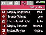Display Brightness: Offers a three-step adjustment to the LCD brightness, trading off battery life for a more visible LCD display in bright ambient lighting conditions. Choices are Low, Medium, or High. - Sounds Volume: Adjusts the volume of camera sounds, with options including High, Low or Off.