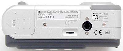 The bottom of the camera has a tripod mount, battery compartment door, and LCD monitor brightness adjustment dial. The plastic tripod mount and battery compartment are far enough from each other to allow battery changes while working with a tripod, which is always beneficial. However, the LCD brightness adjustment dial is completely hidden by the tripod mount plate. (This isn't much of an issue for most users, given the RDC-6000's more practical, portable applications.) The battery compartment is accessed via a plastic door, which slides outward and then opens to reveal the battery pack.