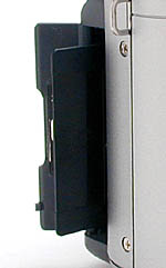 The right side of the camera features the SmartMedia card slot and the wrist strap attachment eyelet. The SmartMedia slot is protected by a hinged, plastic door that snaps firmly into place. We were somewhat mystified with the design of the card release lever, which requires a fairly strong (and long) fingernail to pop it into position. In fact, we also found the card slot door a little difficult to open, with the placement of the access notch slightly difficult to maneuver.