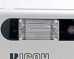 The front of the camera houses the lens, built-in flash, flash sensor, self-timer LED, viewfinder window, and remote control sensor. Ricoh solved the lost lens cap problem by placing a stationary, clear plastic protective cover over the lens. Though we appreciate not having to keep track of a removable lens cover, we're concerned that the plastic itself could be scratched or smudged, causing anomalies to show up in captured images. (You can avoid this problem by keeping the camera in the accompanying soft case whenever it's not in use.) A set of tiny raised finger grips and a large, rubber ridge on the front of the camera provide a firm, comfortable hold. A small rubber grip below the lens provides extra support for a two-handed hold.
