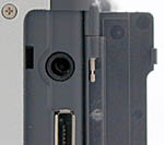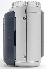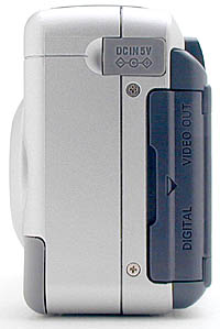 The opposite side of the camera houses the DC-in (power) terminal, as well as the Video Out and serial port connection jacks. The DC-In port is protected by a soft rubber flap which is connected to the camera body by a small rubber strap. Both the Video-Out and serial port jacks are covered by another hinged plastic door, similar in design to the one covering the SmartMedia compartment (though a little less difficult to open).