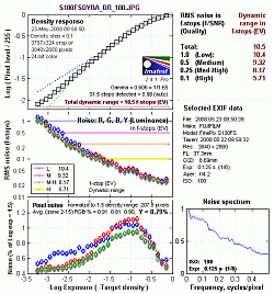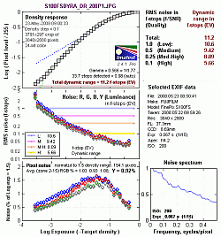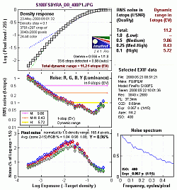 Imatest Dynamic Range Analysis. Above are the Imatest results for the four dynamic range settings when analyzing in-camera JPEGs of the Stouffer 4110 density step target we normally shoot for analyzing SLR dynamic range. (Click on the thumbnails for larger images.) Here, you can see total dynamic range increased from 10.5 f-stops in 100% mode, up to 11.2 f-stops in 200% and 400% modes. (Keep in mind the step target used for this analysis is different than the outdoor portrait above.). The system appears to work much better at preserving highlights, so we got better results when we increased exposure compensation slightly to +0.3 EV at the higher settings. Going above +0.3 EV didn't seem to help the results though. A total of 11.2 f-stops rivals many SLRs, but once noise is taken into account (see the column of numbers in red at the top right-hand side of the charts), the S100FS doesn't perform as well as the vast majority of SLRs.