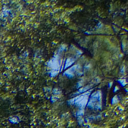 Sharpness. The Fuji FinePix S100FS' captures sharp images, with very good definition that responds well to additional sharpening during post-processing. Only very slight enhancement artifacts are visible, such as in the crop above left. (Apologies, the surrounding trees have been overgrowing our shooting location for this shot, and Luke didn't move quite far enough down the hill to get a clear view of the fine pine foliage in the background. -- You can see it peeking around the foreground leaves though, and the level of fine detail revealed in the full image is quite good.) Edge enhancement creates the illusion of sharpness by enhancing colors and tones right at the edge of a rapid transition in color or tone.