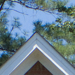 Overall pretty good image sharpness. A small amount of visible edge enhancement in areas of high contrast, and a fair amount of noise suppression in shadow areas. Much more detail is available from the RAW files than appears in the in-camera JPEGs though.