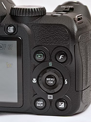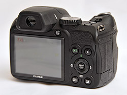 The back of the Fujifilm S2000HD is the business end, populated with the viewfinder, the LCD, the button to switch between them, and the controls. There's a Selector button surrounded by a four-way navigator ring which is surrounded by four buttons. The Playback button is top left, the Photo mode button (which accesses lots of goodies when you're shooting) is top right, EV is bottom right, and Display/Back is bottom left.