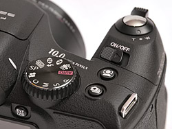 The rest of the top deck has the popup flash, the large Mode dial and two buttons. The Intelligent Face Detection/Red-Eye Removal button is furthest forward and the Burst mode button just behind it.