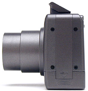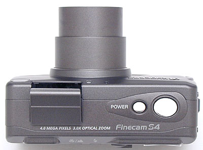 The S4's front panel is reasonably smooth with the lens retracted, leaving just a small protrusion around the outside ring of the lens barrel. A protective shutter automatically opens when the camera is powered on, as the lens telescopes outward (thus eliminating the need for a lens cap). The camera's pop-up flash also automatically opens when the camera is powered on, making the flash visible from the front. (The flash closes itself as well, whenever the camera is shut off.) Below the flash compartment and to the right is the front of the optical viewfinder window. On the opposite side of the flash compartment are the camera's light sensor and the Self-Timer LED lamp.