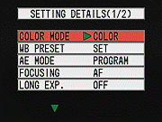 Equipped with a 7.3-21.9mm lens, equivalent to a 35-105mm lens on a 35mm camera, the S4 provides a true, 3x optical zoom. Maximum aperture ranges from f/2.8 to f/4.8, depending on the zoom setting, and remains under automatic control most of the time. However, through the Manual exposure menu, you can manually set the aperture to fixed apertures of f/2.8 or f/9.6. Focus ranges from 1.96 feet (60 centimeters) to infinity in normal AF mode, and from 6.69 to 23.6 inches (17 to 60 centimeters) in Macro mode. A manual focus option is available, though the S4's distance readout on the LCD monitor makes it a little tough to accurately gauge focus, and the camera offers a total of only 7 focus settings to cover the range from 60 cm to infinity. The image in the LCD monitor also doesn't enlarge in manual focus mode, so it's hard to know whether or not you have the focus properly set. While I always like to see manual focus options on cameras as an assist when shooting under low-light conditions, the S4's implementation is so hampered by its lack of distance readout or focus feedback that it doesn't seem particularly useful. A Landscape mode sets focus at Infinity, for shots of scenery though, and this could be handy for night shots at a distance. In addition to the 3x optical zoom, the S4 also features as much as 2x digital zoom. Remember though, that digital zoom decreases the overall image quality in direct proportion to the magnification achieved because it simply enlarges the center pixels of the CCD's image. For composing shots, the S4 has both a real-image optical viewfinder and 1.5-inch polysilicon, TFT, color LCD monitor. The LCD monitor's information display includes basic camera information, such as the shooting mode and image quality setting, as well as the current image capacity of the memory card. A set of focus/exposure brackets is in the center of the display, for lining up shots.