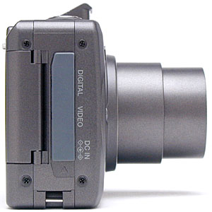 The right side of the S4 (as viewed from the back) holds the connector compartment, protected by a flexible, rubbery flap that remains tethered to the camera at the top. Beneath this covering are the Digital, Video, and DC In connector jacks. Directly below the connector compartment is an eyelet for attaching the wrist strap. Also on this side of the camera is the SD memory card slot. The hinged door over the card slot is released by a latch on the back panel before swinging open to reveal the card.
