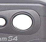 The majority of the S4's controls are on its rear panel, along with the LCD monitor and optical viewfinder. A set of LED lamps next to the optical viewfinder eyepiece report camera status, such as when focus and exposure are set, the battery is charging, or the flash is charging. The viewfinder eyepiece is very small, and thus rather sensitive to the lateral position of your eye. The viewfinders eyepoint is high enough that it's quite usable with eyeglasses, but I found I needed to have my eyeball lined up pretty exactly with the eyepiece to be able to see well through it. Lining the top of the back panel are the Macro/Landscape, Flash, and Zoom buttons, as well as a Mode switch that controls the camera's main operating mode. (Record, playback, or setup.) A Four Way Arrow pad in the center of the back panel controls a variety of functions, with an OK button in the center to confirm camera settings. Also on the back panel are the SD compartment cover latch, and Menu and Display buttons.