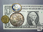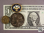 The S404 captured a slightly large minimum macro area at 4.3 x 3.2 inches (109 x 82 millimeters). Resolution is high, with great detail in the coins, brooch, and dollar bill. Details are sharp, with the exception of slight softness in the corners of the frame. Color balance is slightly warm, but basically pretty good. The camera's flash throttled down very nicely for the macro area, producing just a tiny hot spot on the brooch (due to a specular reflection) and slight falloff in three corners. |