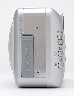 The opposite side of the camera has a soft rubber terminal cover that lifts up in two steps. The top pulls back to reveal the A/V Out and Digital jacks, and the bottom pulls out further so the cover can swing out of the way to make connections.