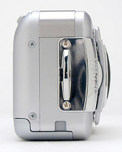 The S45's bottom panel is reasonably flat, with a sliding door to access the combined CompactFlash and battery compartment, and a threaded metal tripod mount on its left. The tripod mount is positioned slightly off-center, directly below the lens, making it easier to properly frame shots for panoramic series, although it's a little back from the lens' optical center. Because the battery door and tripod mount are so close to one another, it would be difficult to make quick battery changes while working with a tripod, something I'm probably more sensitive to than most users, given the amount of on-tripod shooting I do. On the other hand, Canon's AC adapter uses a "dummy battery" design, with the cord exiting from a small opening on the camera's right hand side, providing a convenient way to get power to the camera while on a tripod.
