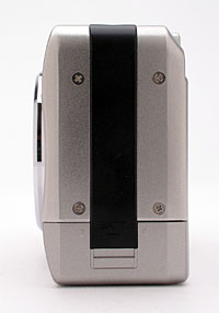 The right side of the S5 (as viewed from the rear) holds the connector compartment, protected by a flexible, rubbery flap that remains tethered to the camera at the top. Beneath the cover are the Digital, Video, and DC In jacks. Directly below the connector compartment is an eyelet for attaching the wrist strap. Also on this side of the camera is the SD memory card slot, which opens from the back panel. The hinged memory compartment door is released by a button on the back panel before swinging open to reveal the card slot.